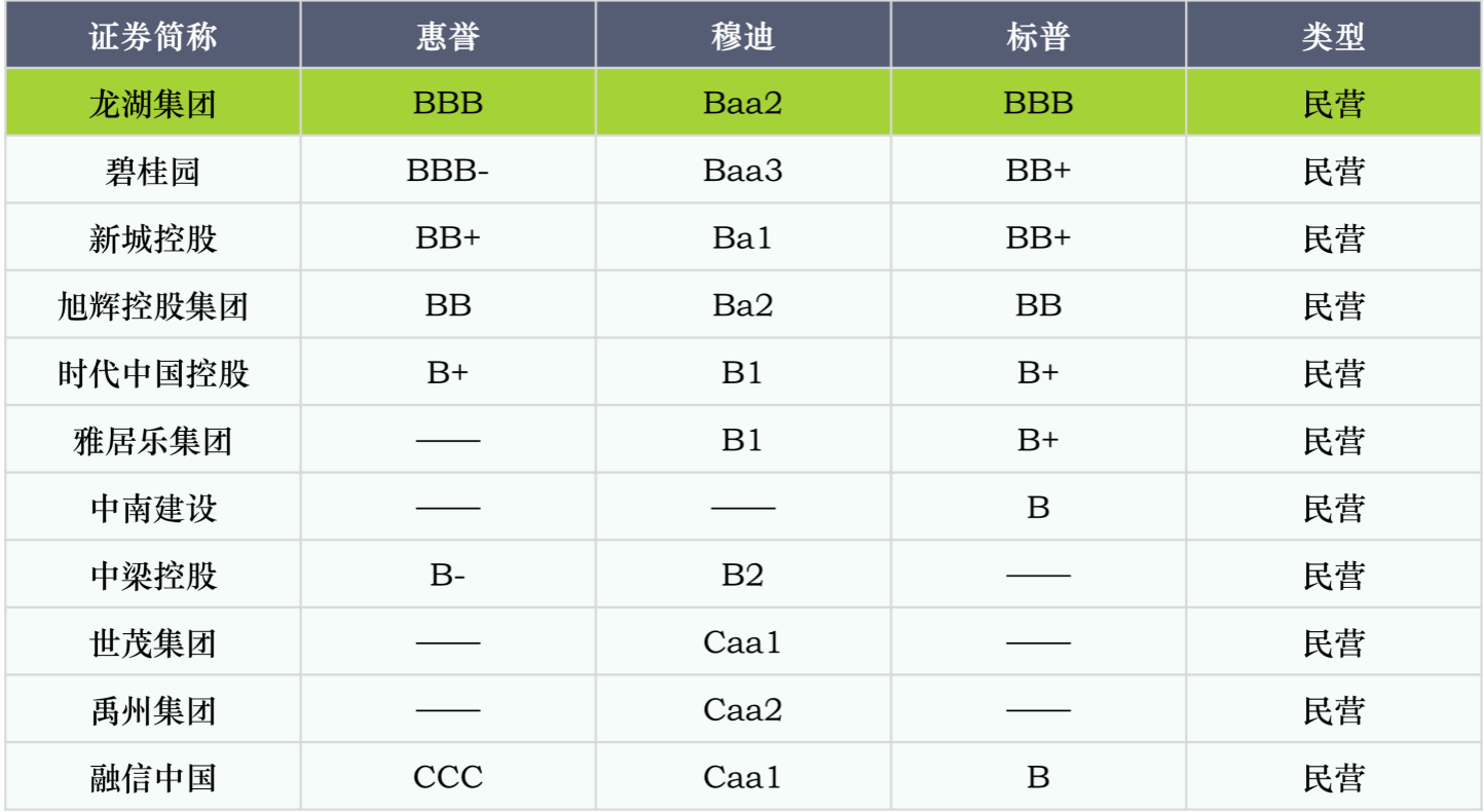 值得一提的是, 2022 年 4 月 12 日,标普、穆迪确认对龙湖的信用评级,分别维持原评级 BBB 、 Baa2 ,展望均为稳定。此前,龙湖已获得惠誉 BBB 评级展望稳定、中诚信证评( AAA )、新世纪( AAA )展望均为稳定。截至目前,龙湖集团是唯一获得境内外“全投资级”评级的民营房企。